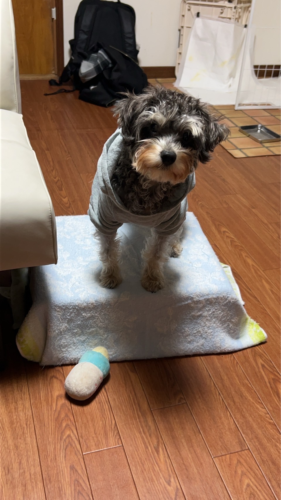 今月で10か月なのでほぼ成犬なわけですが、骨格がトイプーの華奢なボディにくるくるあまり伸びない毛質、体重と顔と毛色がシュナウザーって感じになりました(髭はありますが、お腹の毛が伸びないのでシュナのサマーカット状態w)ちなみに体重が5.7キロで華奢なのに重めです(^^)