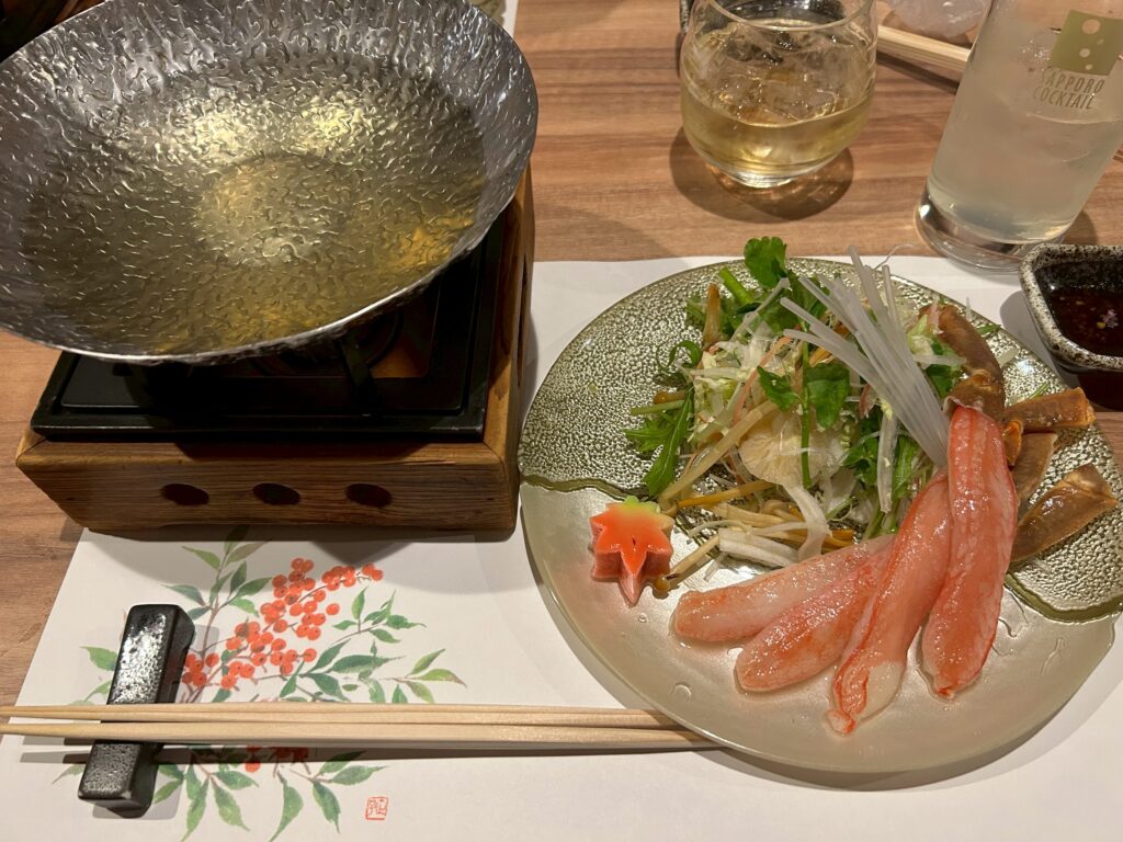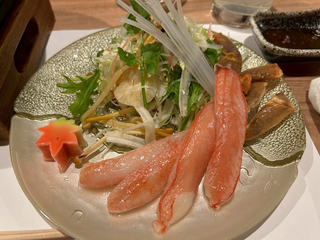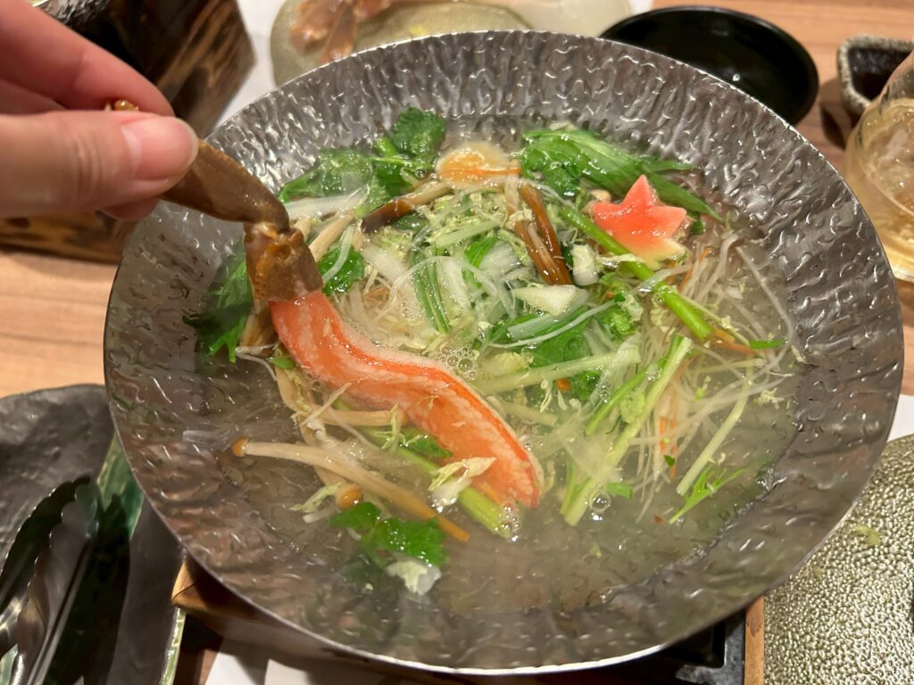 ズワイ蟹のしゃぶしゃぶですよー!!水菜だと思ったら三つ葉も入っていて、風味に野菜のしゃきしゃき感もあってとっても美味しい!