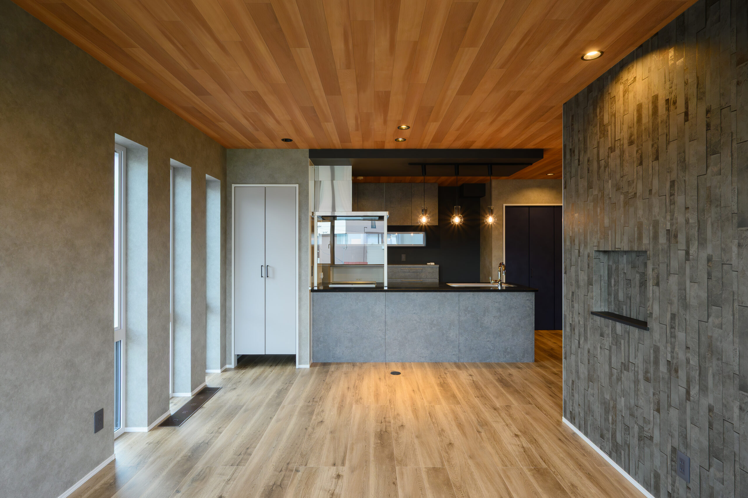 グレーのメインクロスに木目調の天井クロスが非日常空間を作り出す2階LDK。さらにTV背面にはタイル調アクセントクロスをセレクト[サンゲツRE55455/RE55599/RE55653]