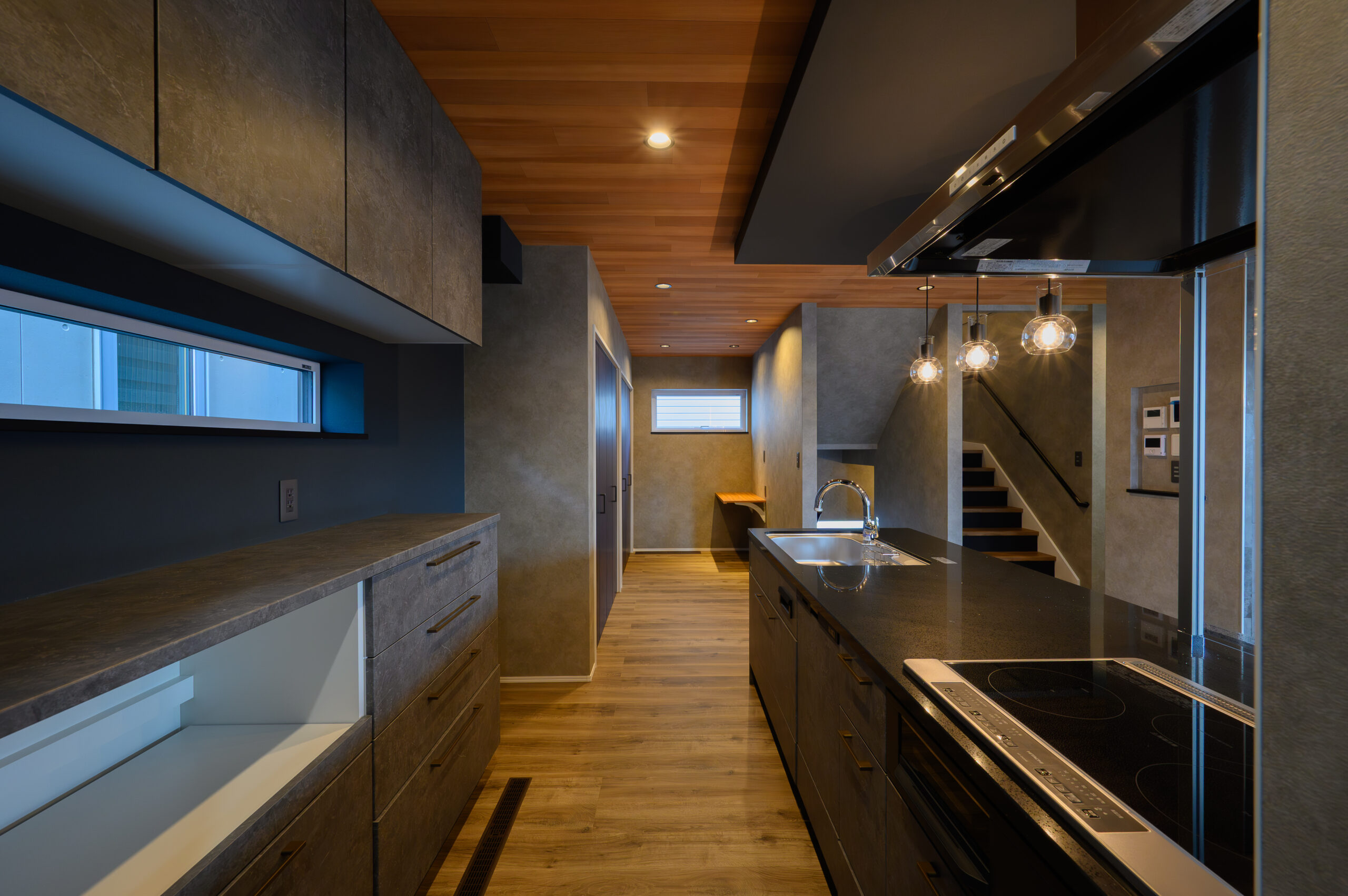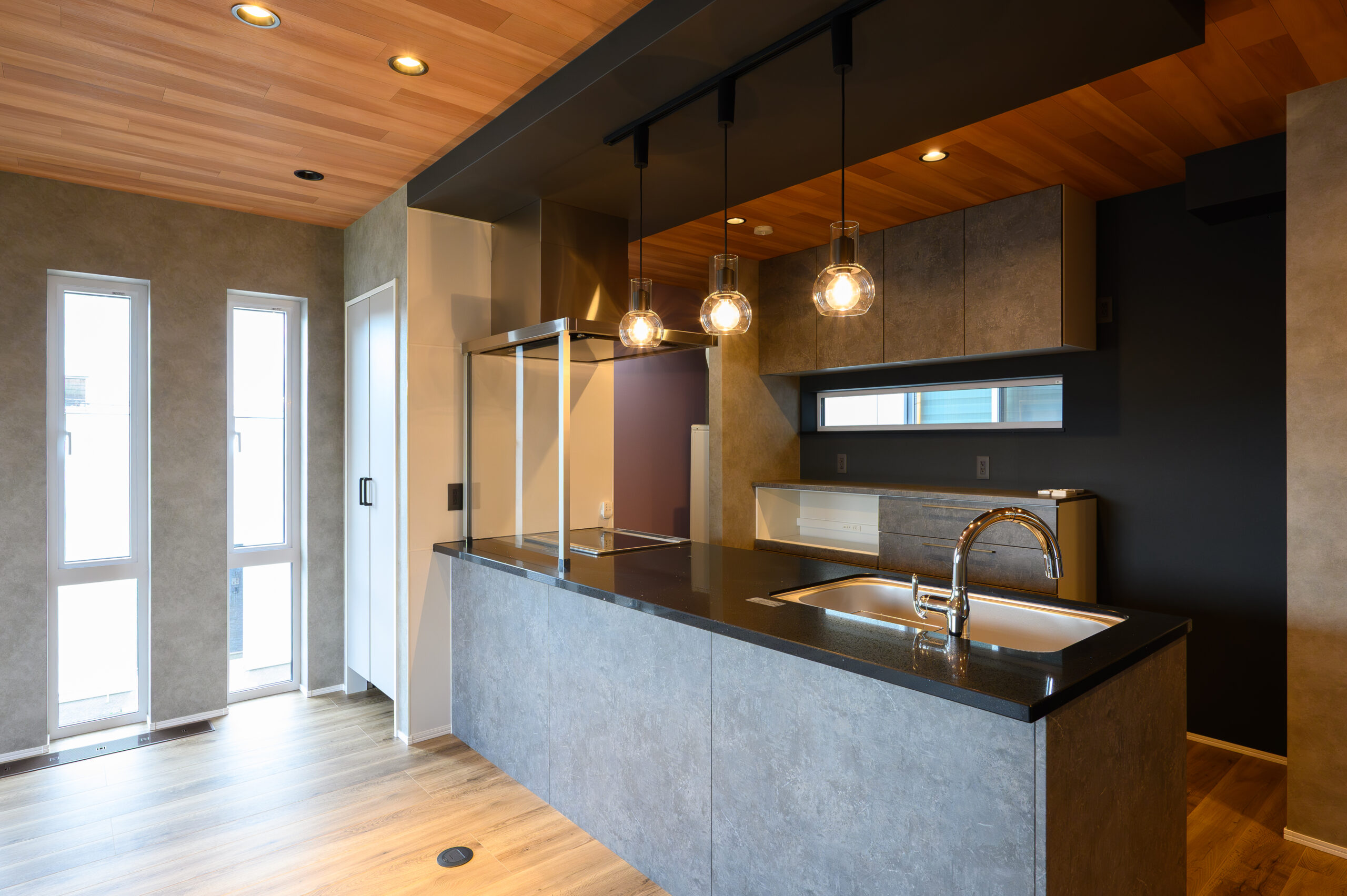 ブラックの折り下げ天井から吊るされたペンダントライトがジュエルブラックのワークトップを艶やかに照らすキッチン[タカラスタンダードオフェリア]