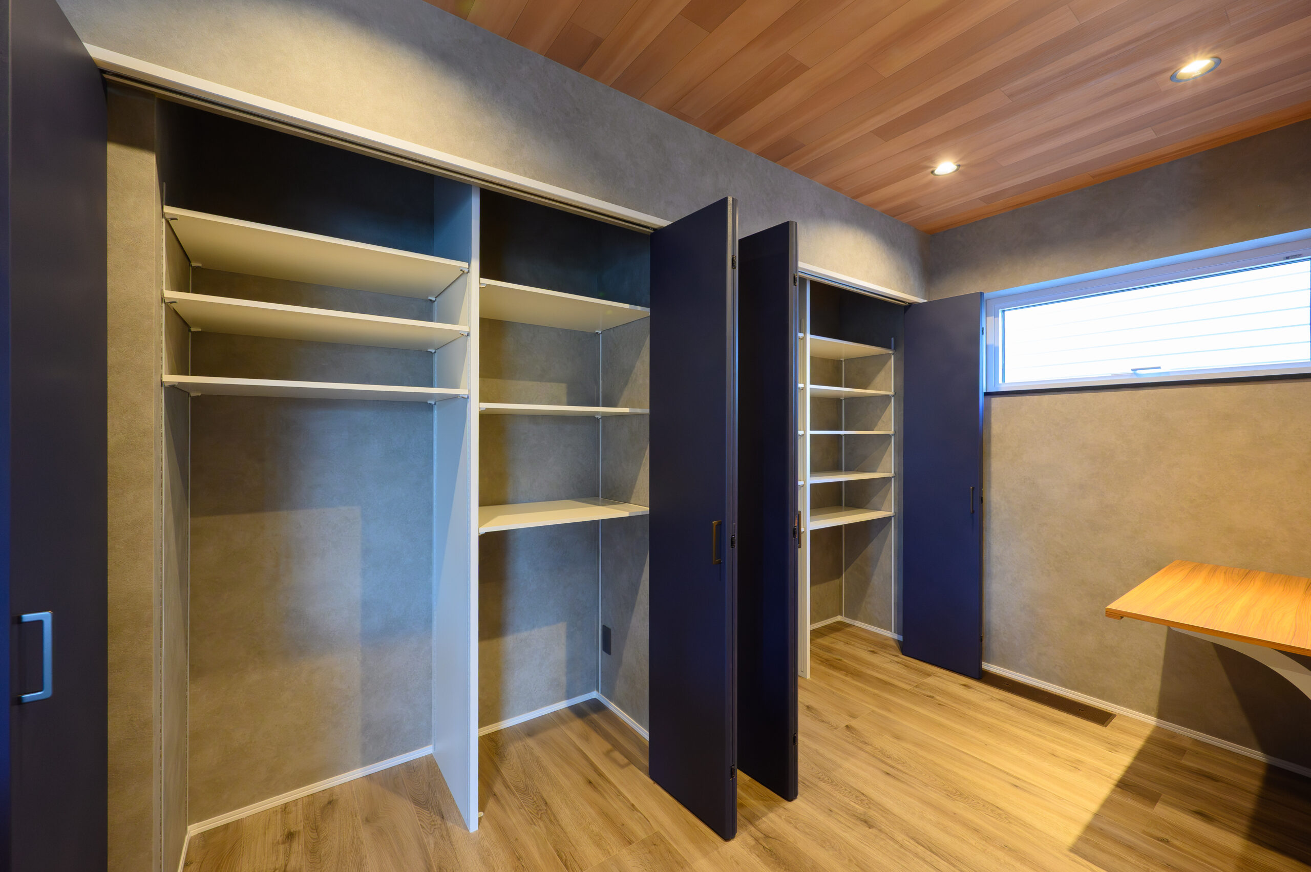 キッチン横には約4帖の趣味スペース。背面には可動棚を設けた大容量のクローゼットを配置[建具LIXILラシッサDヴィンティア ネイビーブルー]