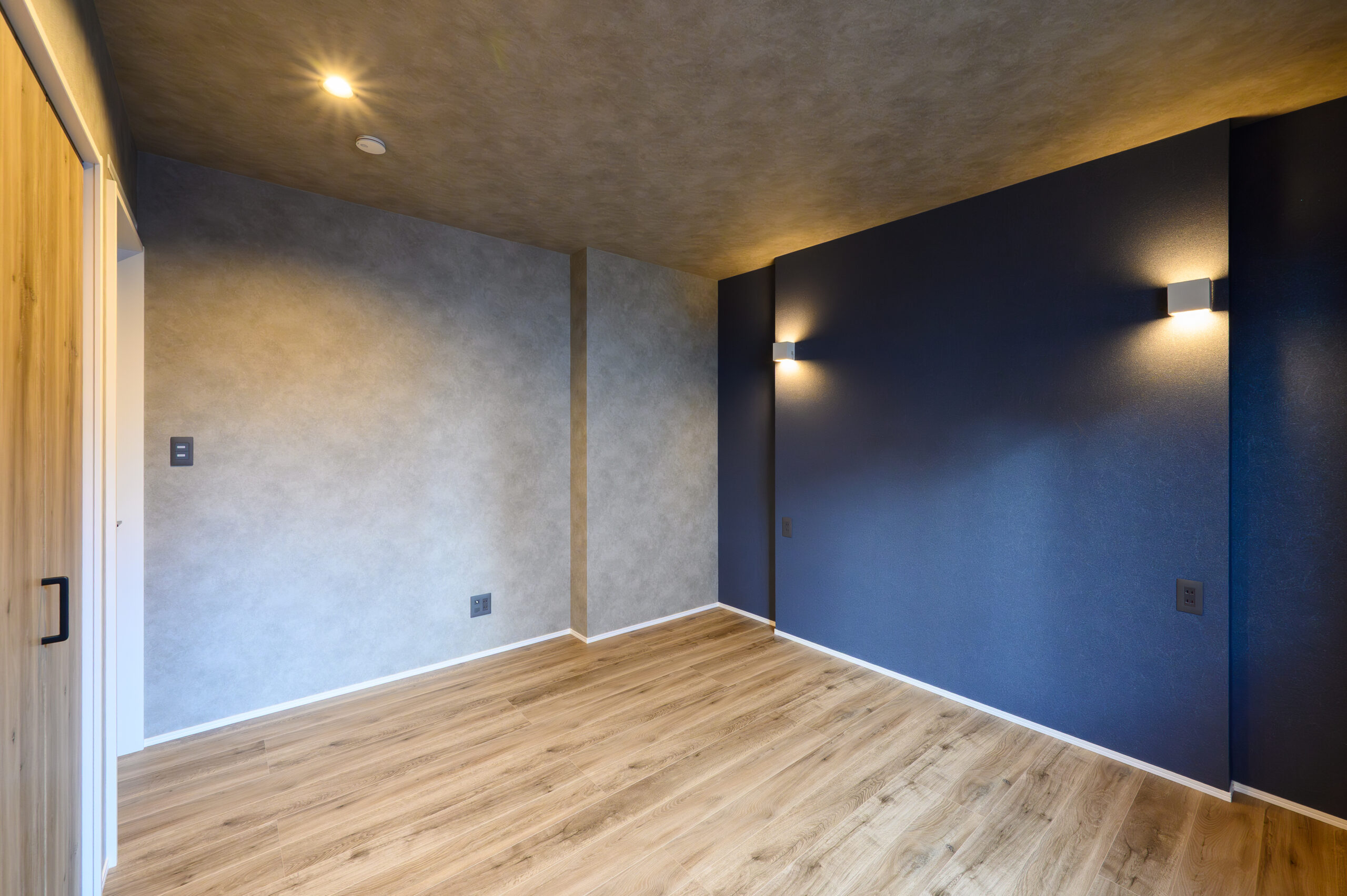 深い色味のアクセントクロスにウォールライトの光が映し出されるモダンな主寝室[サンゲツRERE55079/床LIXILラシッサDフロアアース ラフオークF]