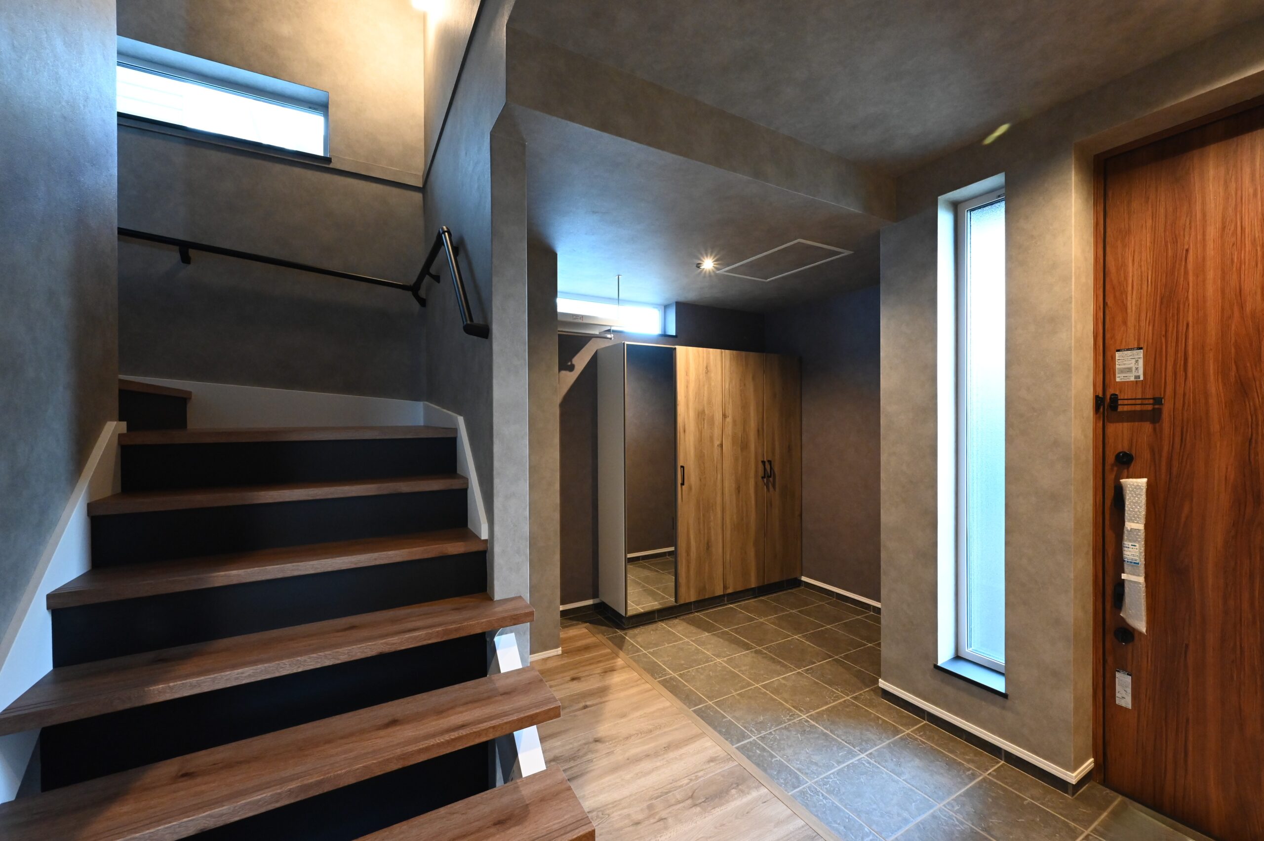 家族が一列に並んでもゆとりがある玄関。階段は子供と手を繋いで昇り降りできる幅約1mのワイドサイズ