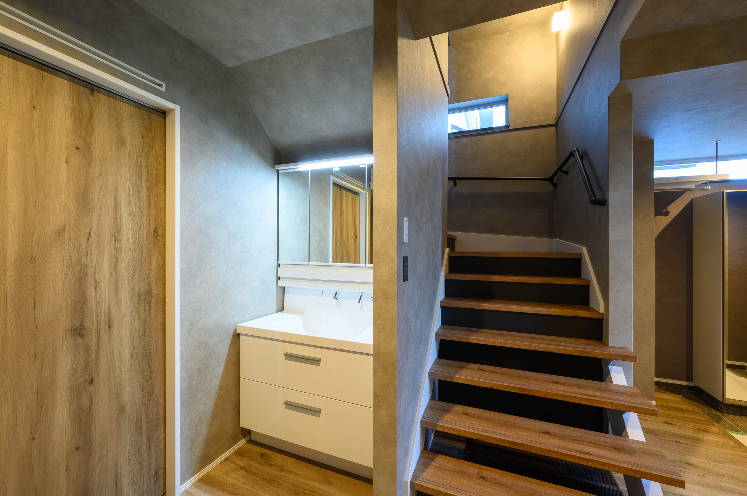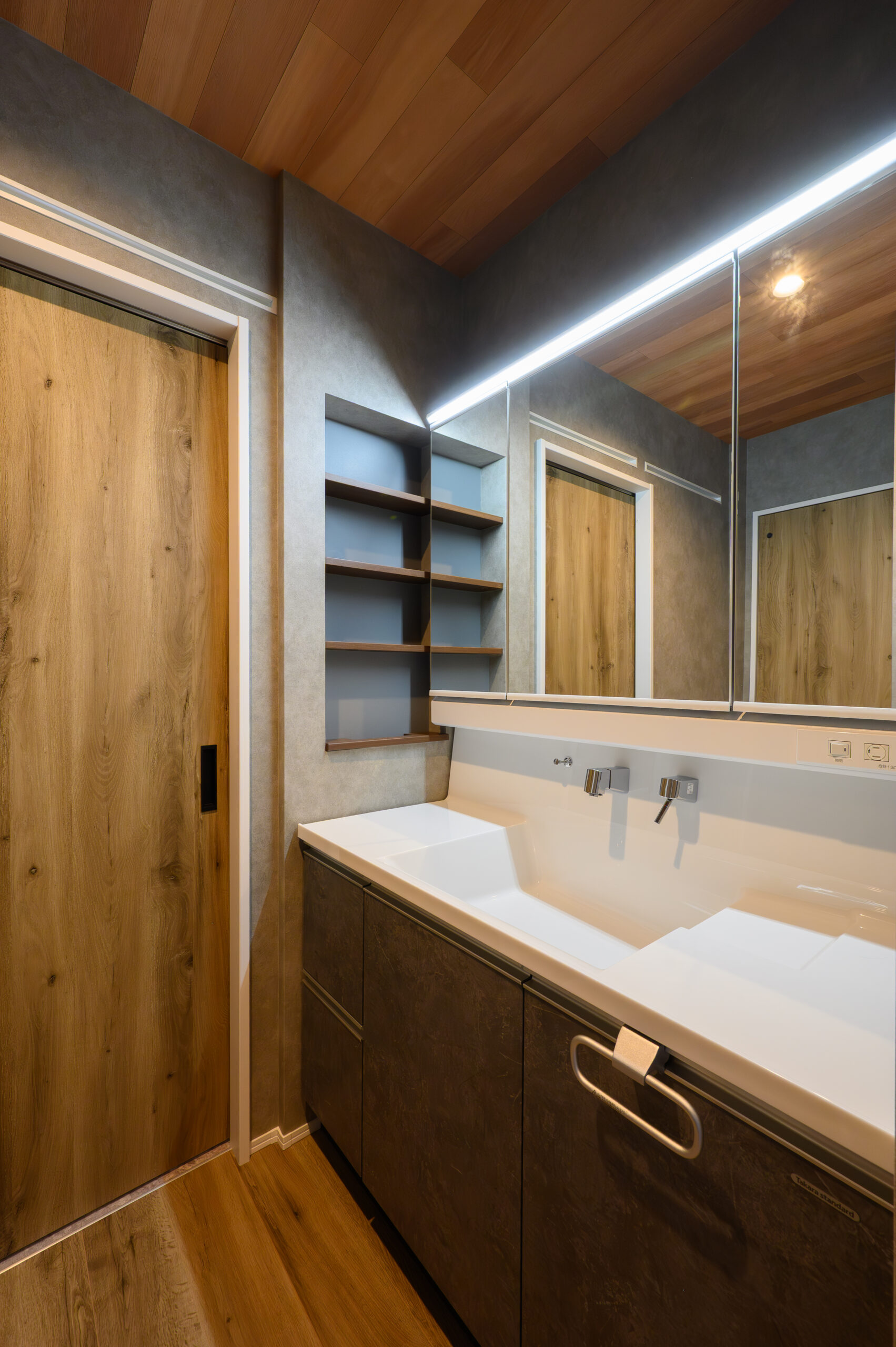 2階には独立した空間にワイドな洗面化粧台を配置。横にはニッチでアクセントをプラス[タカラスタンダード エリシオ]