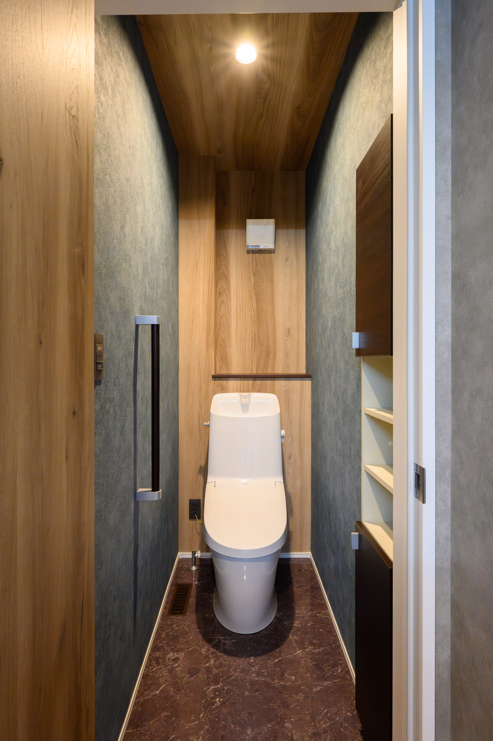 木目とブルーグレーのクロスが落ち着きを感じさせるトイレ[LIXILベーシアシャワートイレ][サンゲツRE55588/55621]