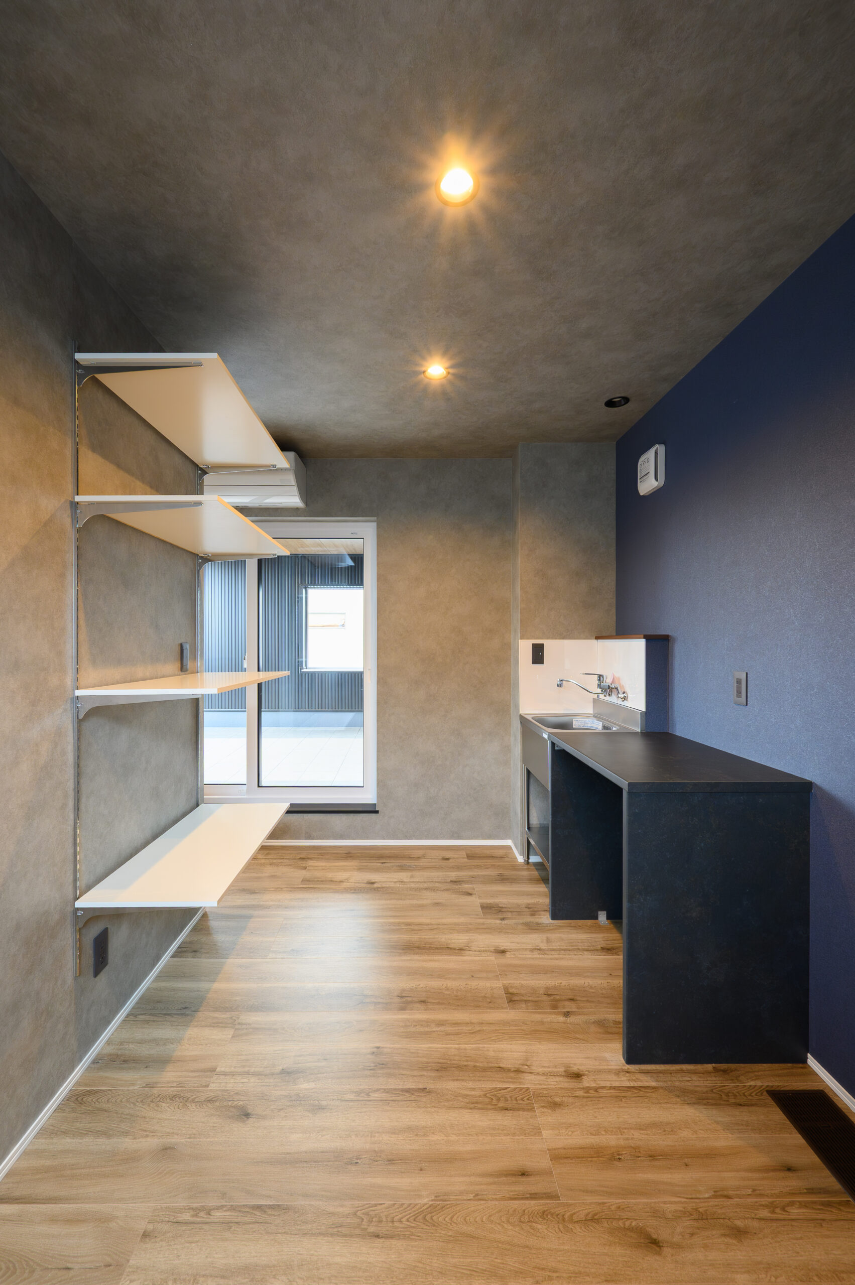 屋上横のフリースペースにはシンクやテーブル、可動棚を設置。趣味室としも楽しめる5帖の広さ