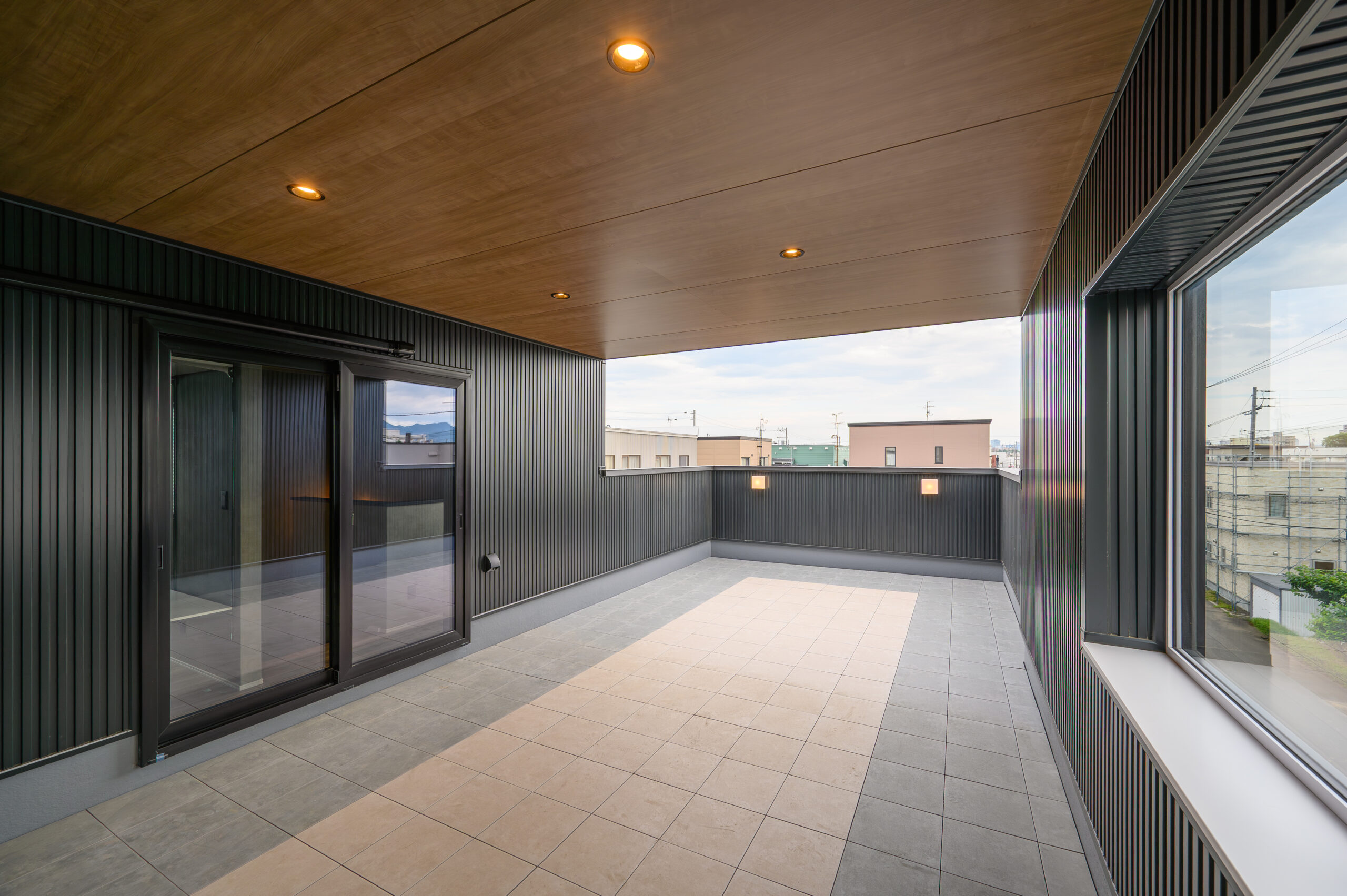 屋根部分10帖を含めた16帖の屋上庭園。ブラックの外壁と木目調の軒天が高級感をプラスする[アイジー工業ガルスパン ネオブラック]