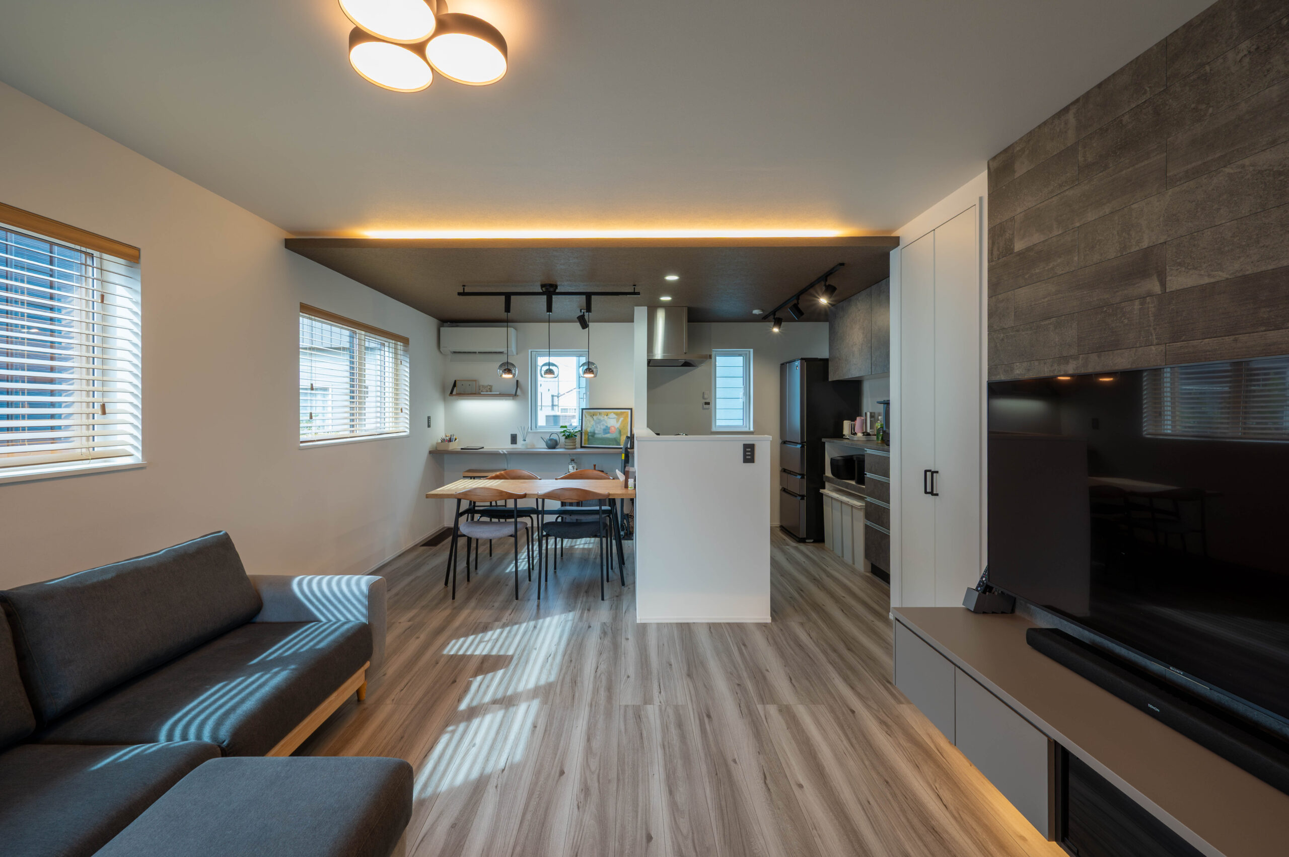 間接照明を設えた下がり天井にエコカラットが際立つ約16.4帖のLDK。床[LIXILラシッサDフロアアース グレージュエルムF]、TV背面[LIXILエコカラット ラフセメント ダークグレー]、TVボード[AICAスマートシューノ]