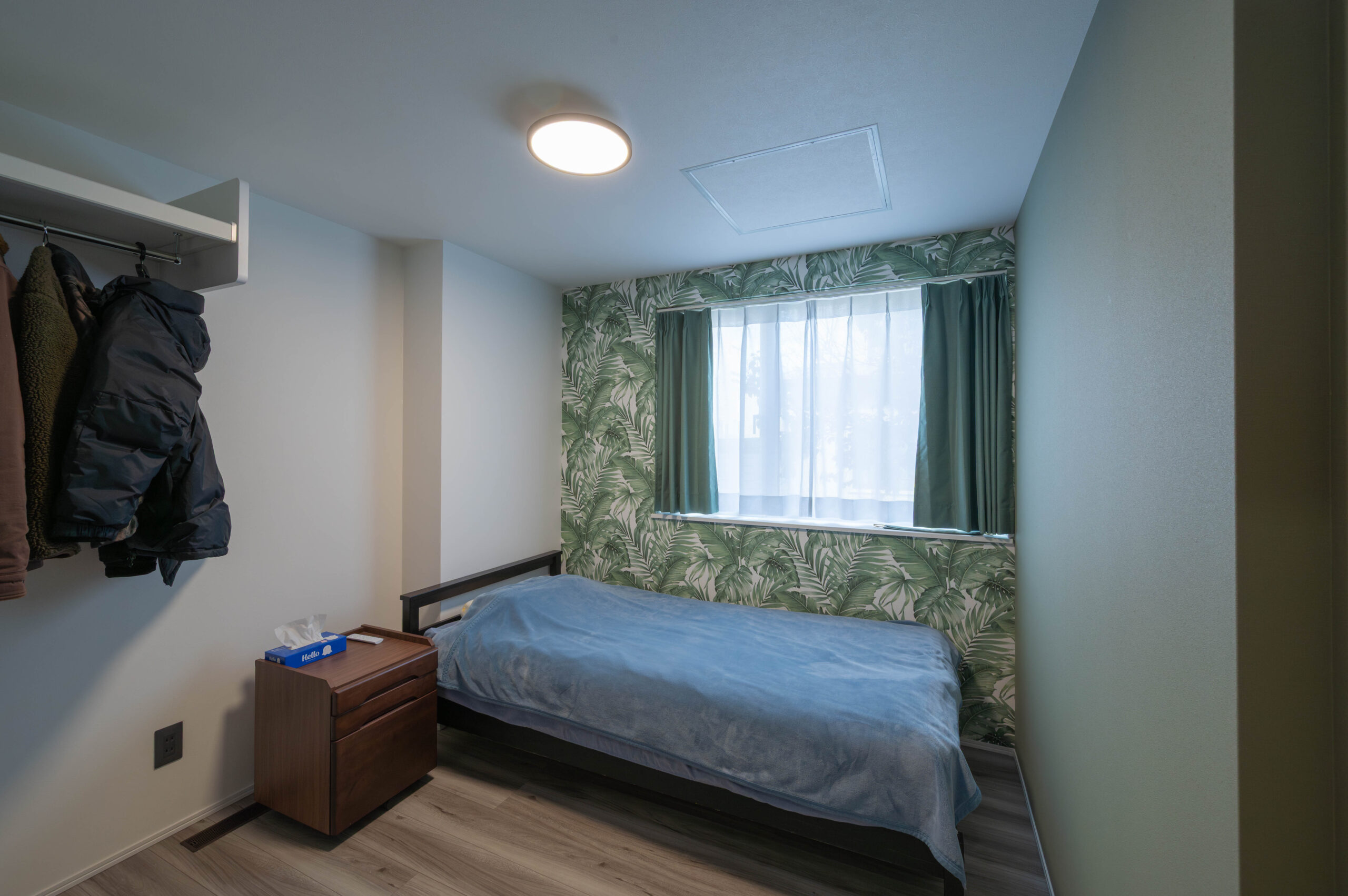 統一感のあるアースカラーとボタニカルデザインの2種類のアクセントクロスを採用した洋室
