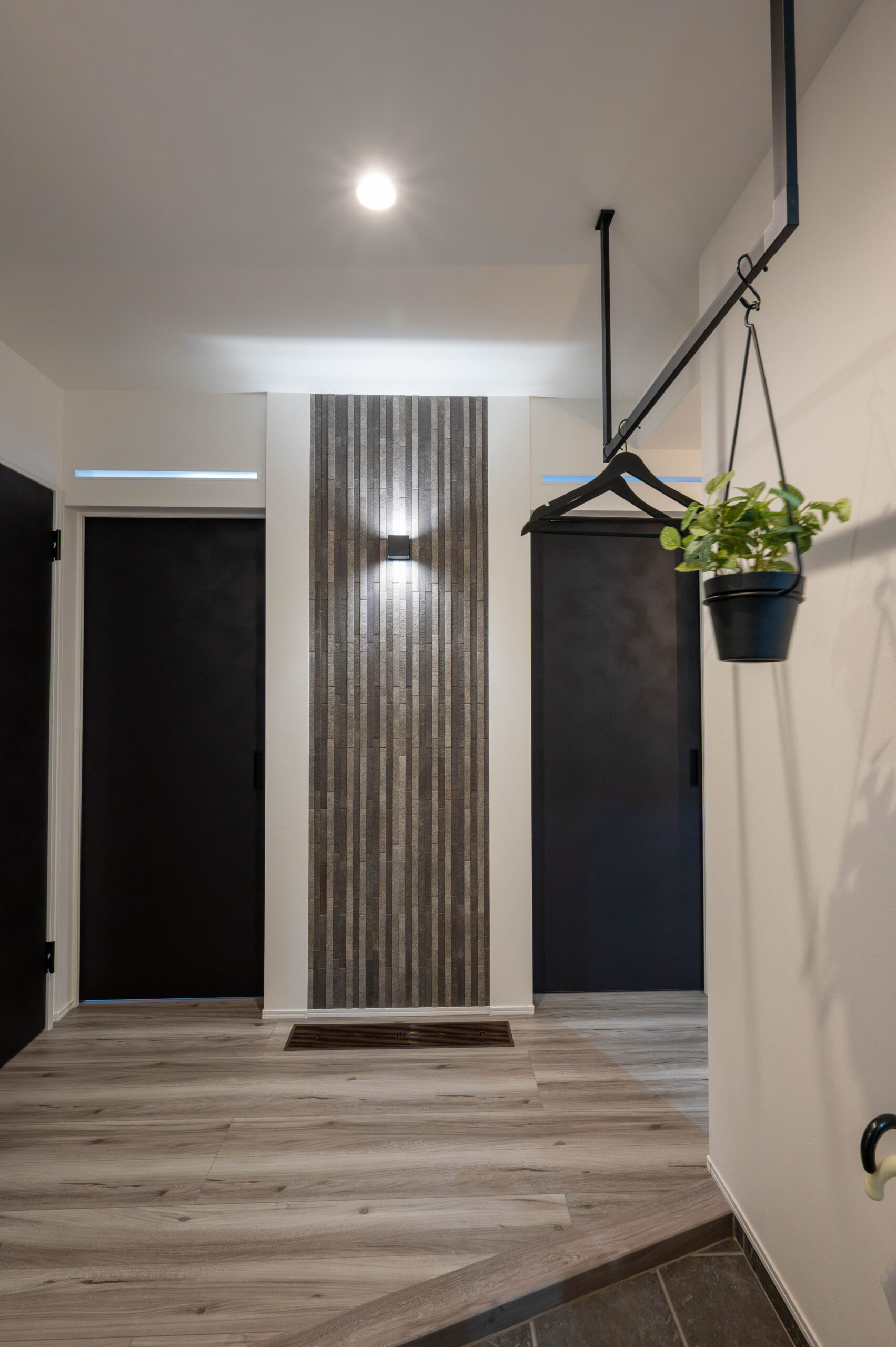 目の前に[LIXILエコカラット 陶連子 灰色]が出迎えるホテルライクな玄関。ハンガーバーに吊るされたグリーンのアクセントが彩を添える