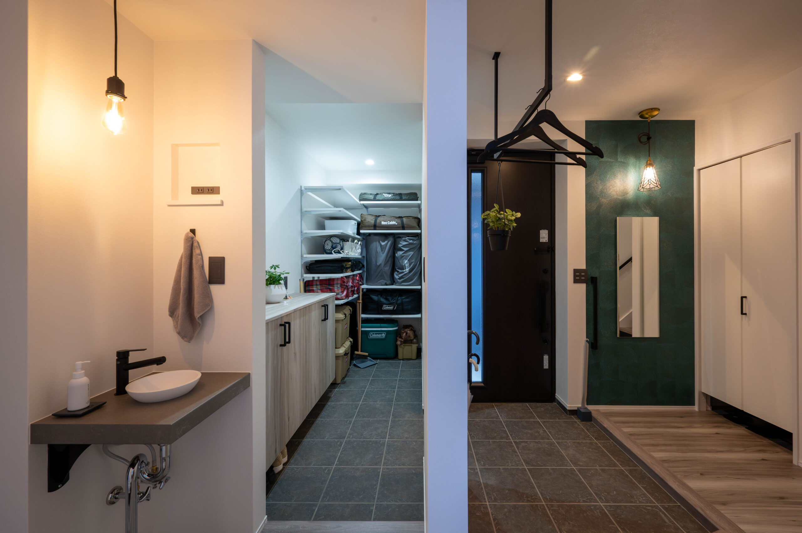 便利な2way玄関。ペンダントライトにアクセントクロス[サンゲツFE76755]が映えるミラーや手洗器[AICAスタイリッシュカウンター]が実用性とデザイン性を兼ねている