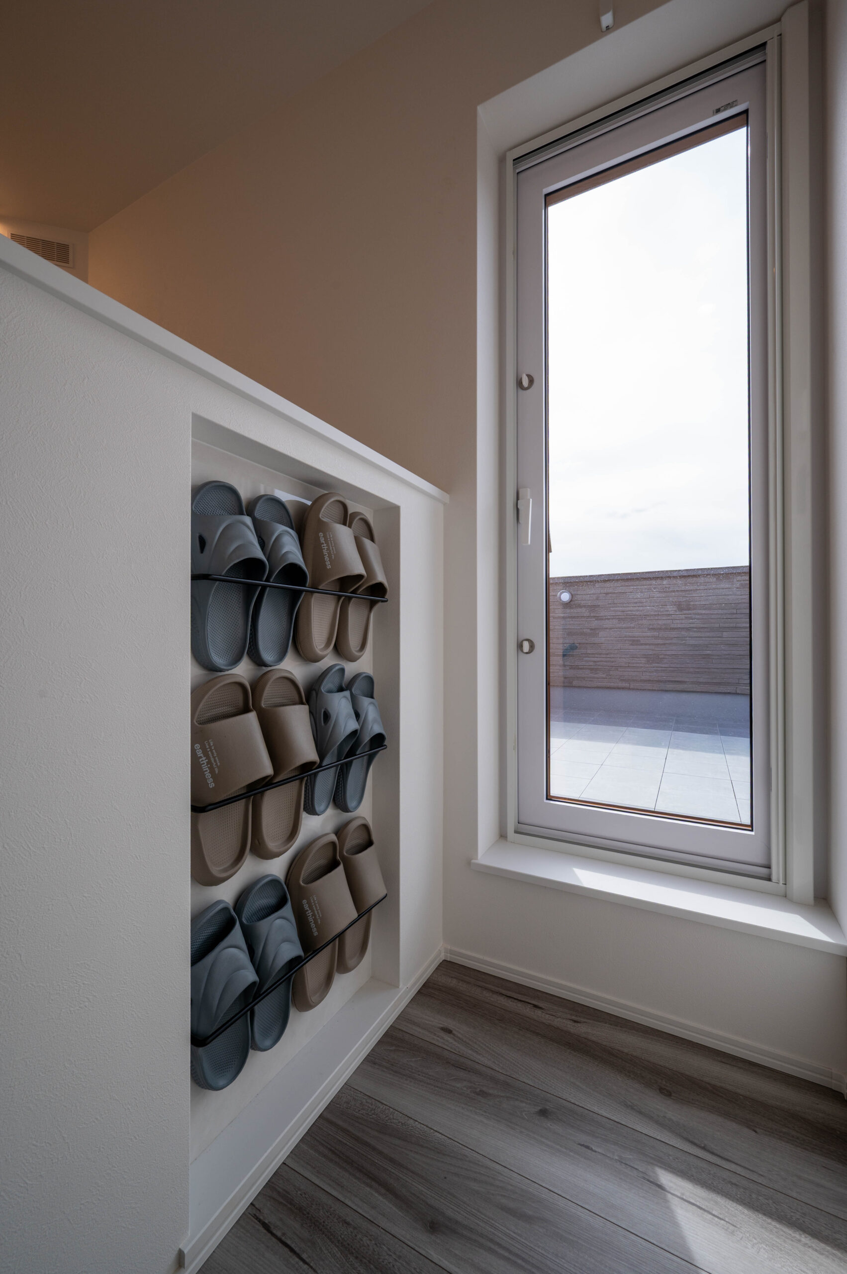1帖の踊り場スペースをすっきりとさせるスリッパニッチ。いつでも気軽に屋上へ出入りできる真似したいアイテム