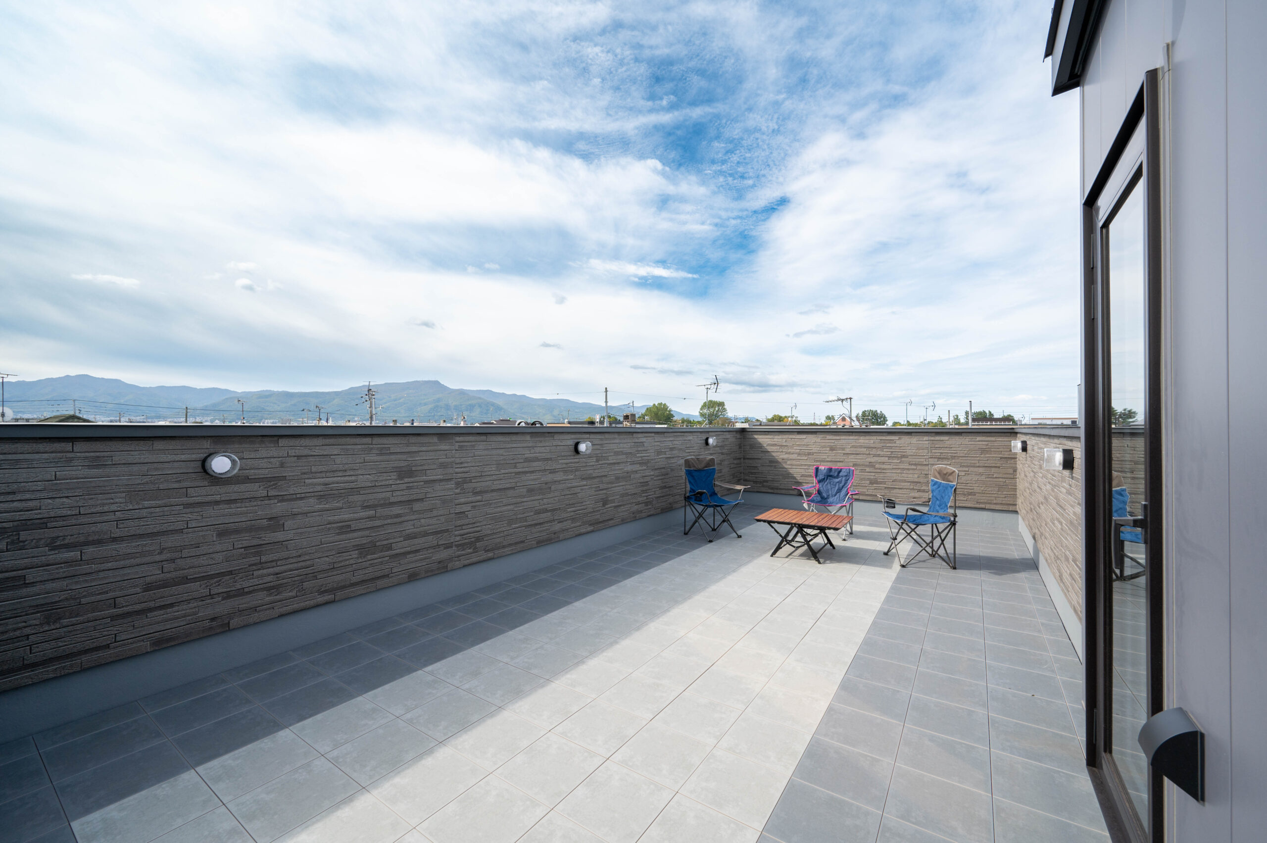 屋根付きの屋上庭園と吹き抜けからお日様が届く土間で年中遊んで暮らせる住まい