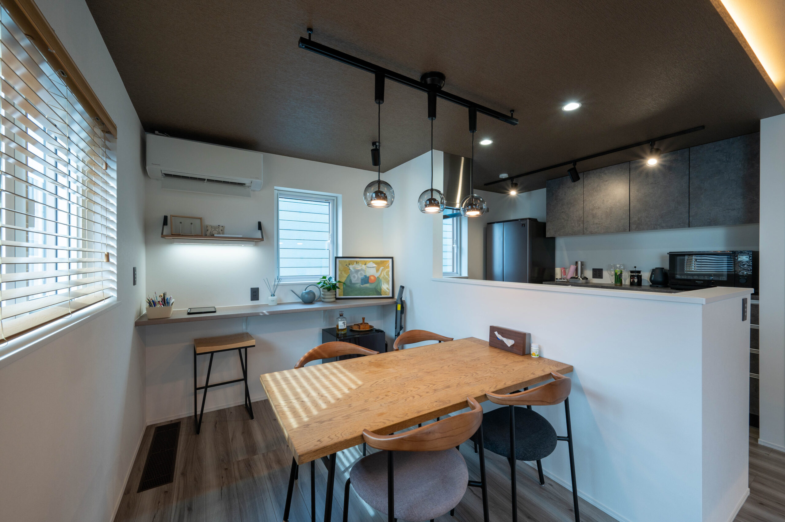 天井のアクセントクロス[サンゲツRE55879]にペンダントライトが映えるダイニング。見守り学習やPC作業などがはかどるカウンターにインテリアとしてもお洒落なウォールシェルフ[AICA棚板]を配置