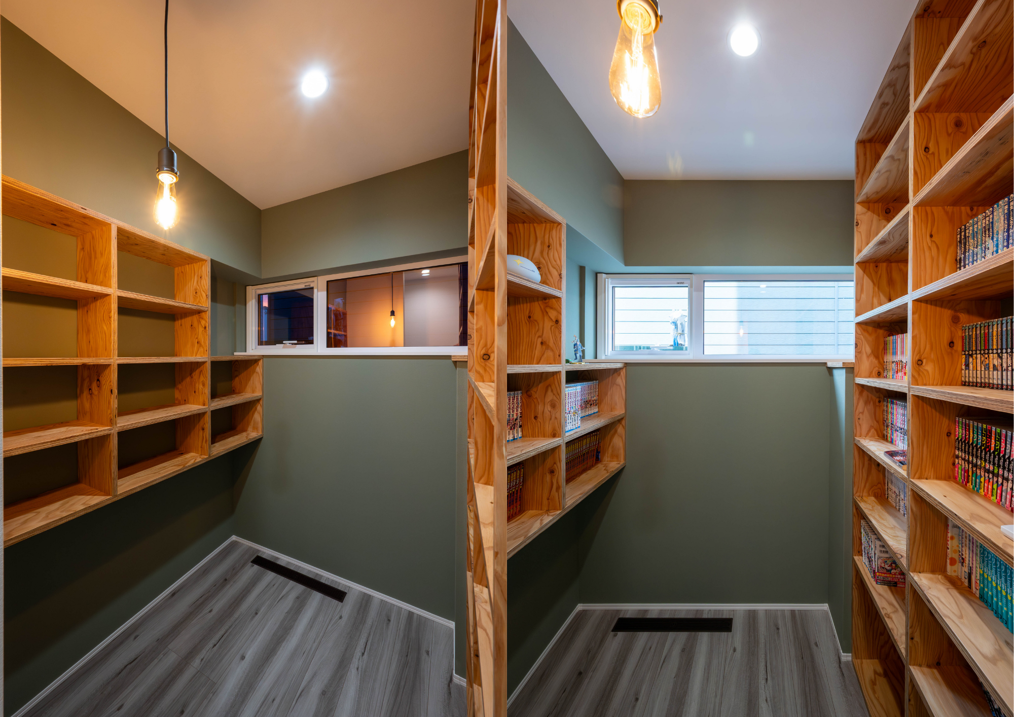 本棚を造作した自慢の書庫。暗くなるとペンダントライトの暖かい光が隠れ家のような雰囲気に一転