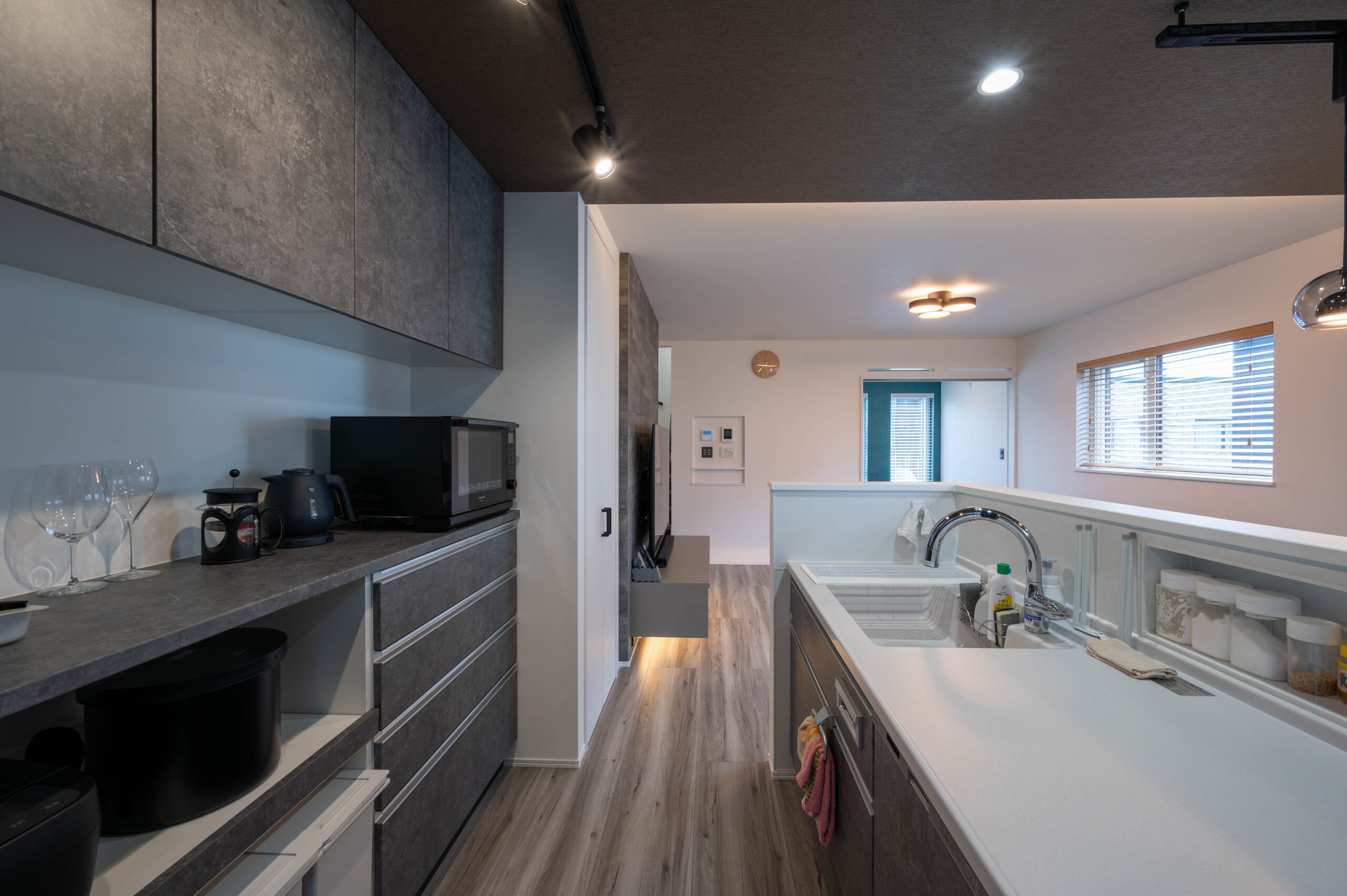 メインクロスがグレー!隠れ家カフェ風の佇まいと生活感を感じさせない収納豊富な住まい