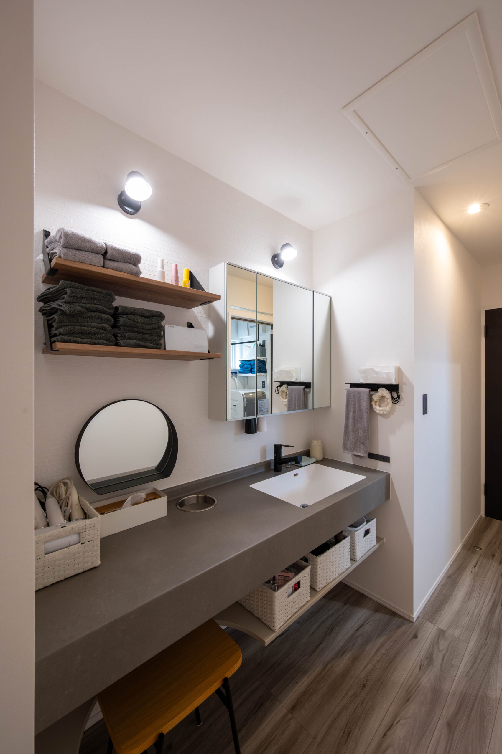 邪魔せずメイクを楽しめる幅広の洗面化粧台[AICAスタイリッシュカウンター]。シェルフミラーやタオルリング[カワジュン]、ウォールシェルフなど使いやすさだけでなくディテールにもこだわった