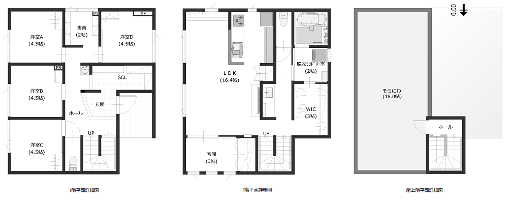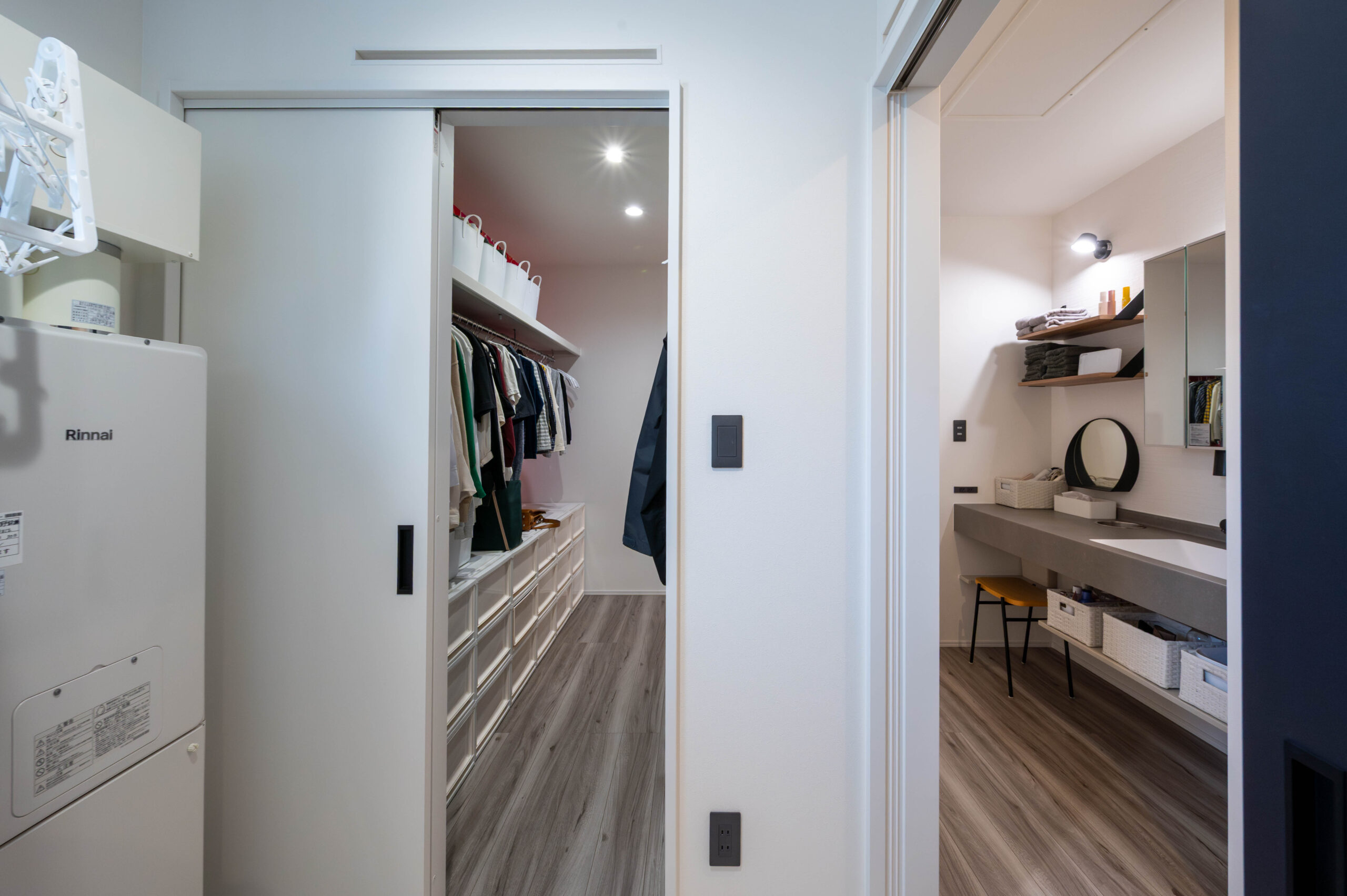 洗面室、脱衣ランドリー室、FCLは回遊動線になっているので目的に合わせて行き来でき、渋滞も解消する効率の良い間取りプラン