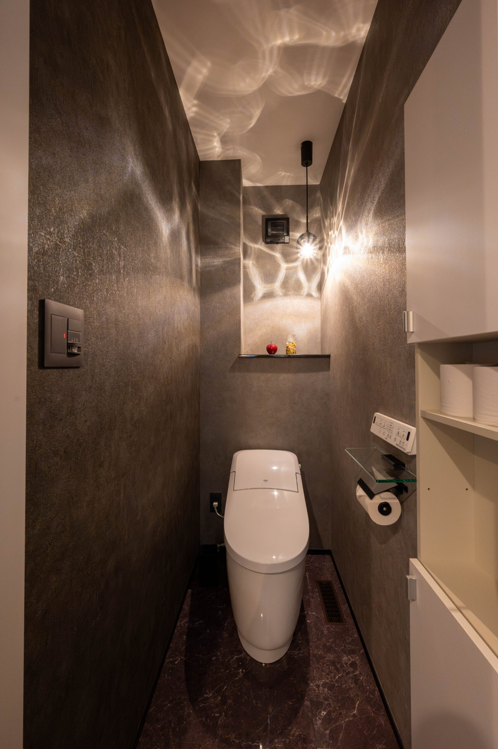 壁に反射する光が幻想的なトイレは生活感を取り除いた非日常の空間に[LIXILベーシアハーモL][サンゲツRE55615/55616]、床[Daiken旧ハピアフロア]