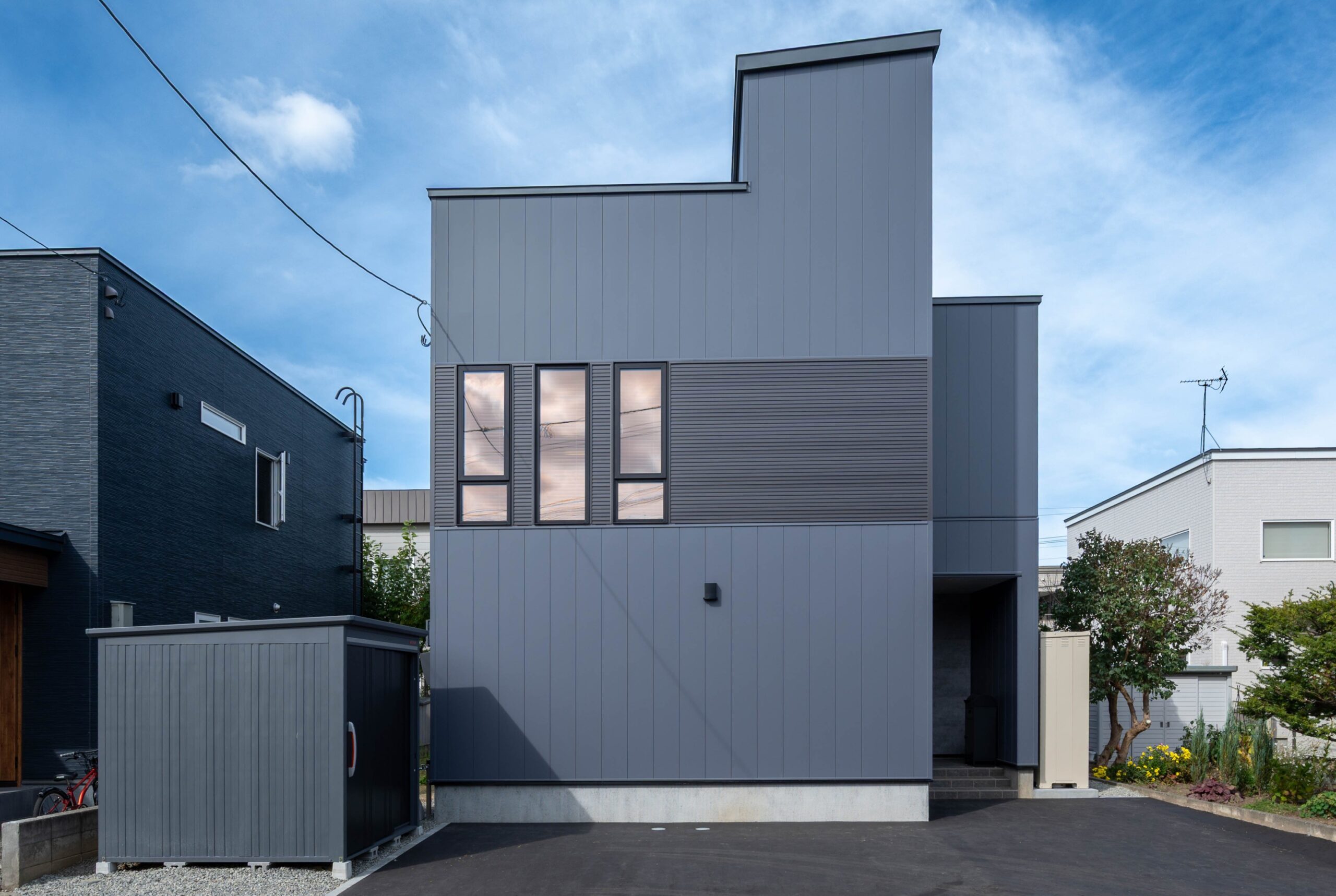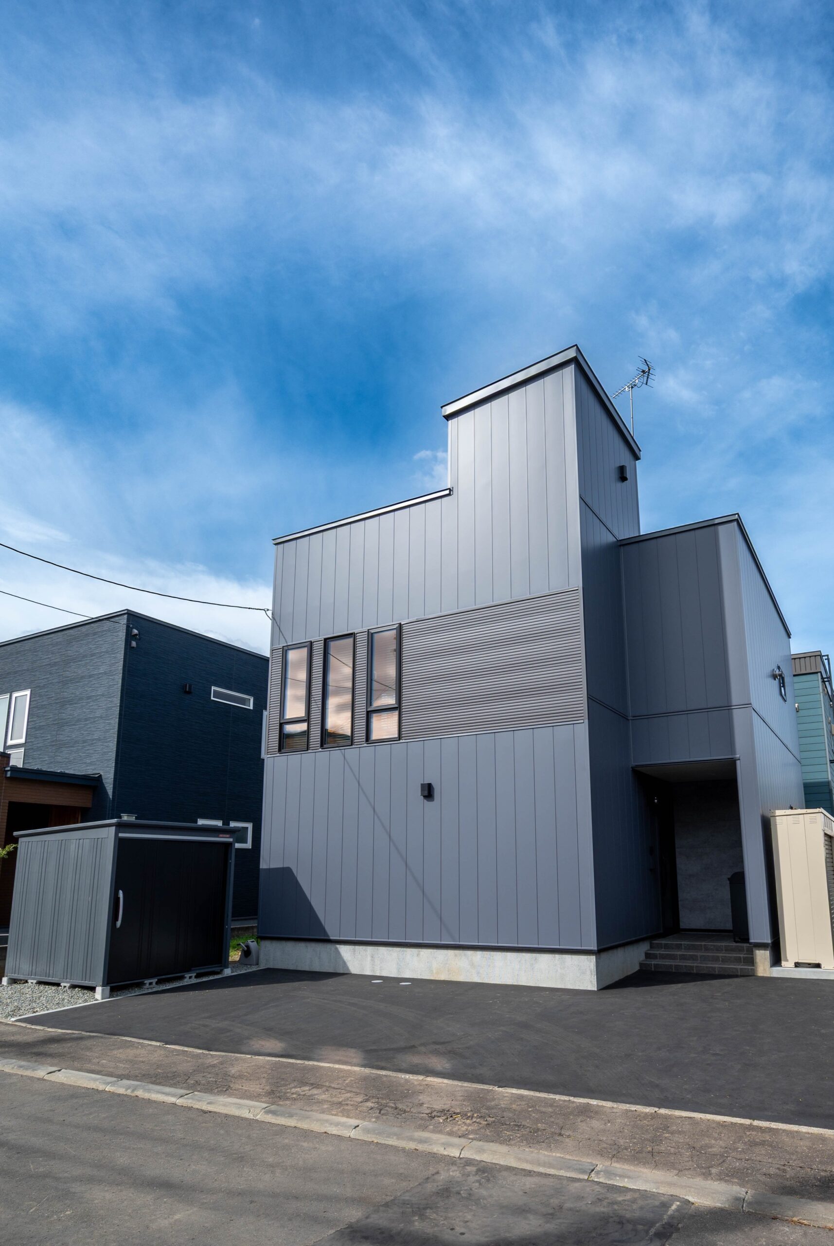 縦張りのサイディングに幅の異なるサイディングを横張にした洗練されたスタイリッシュな外観[アイジー工業ガルブライト スチールグレー/ガルスパン ダークメタリック]